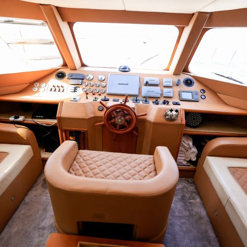The catamaran features two cozy bedrooms and one well-appointed bathroom, making it perfect for both day trips and short overnight stays. The flybridge offers panoramic views, generous seating, and a relaxing space to sunbathe, unwind, or simply enjoy the refreshing sea breeze.