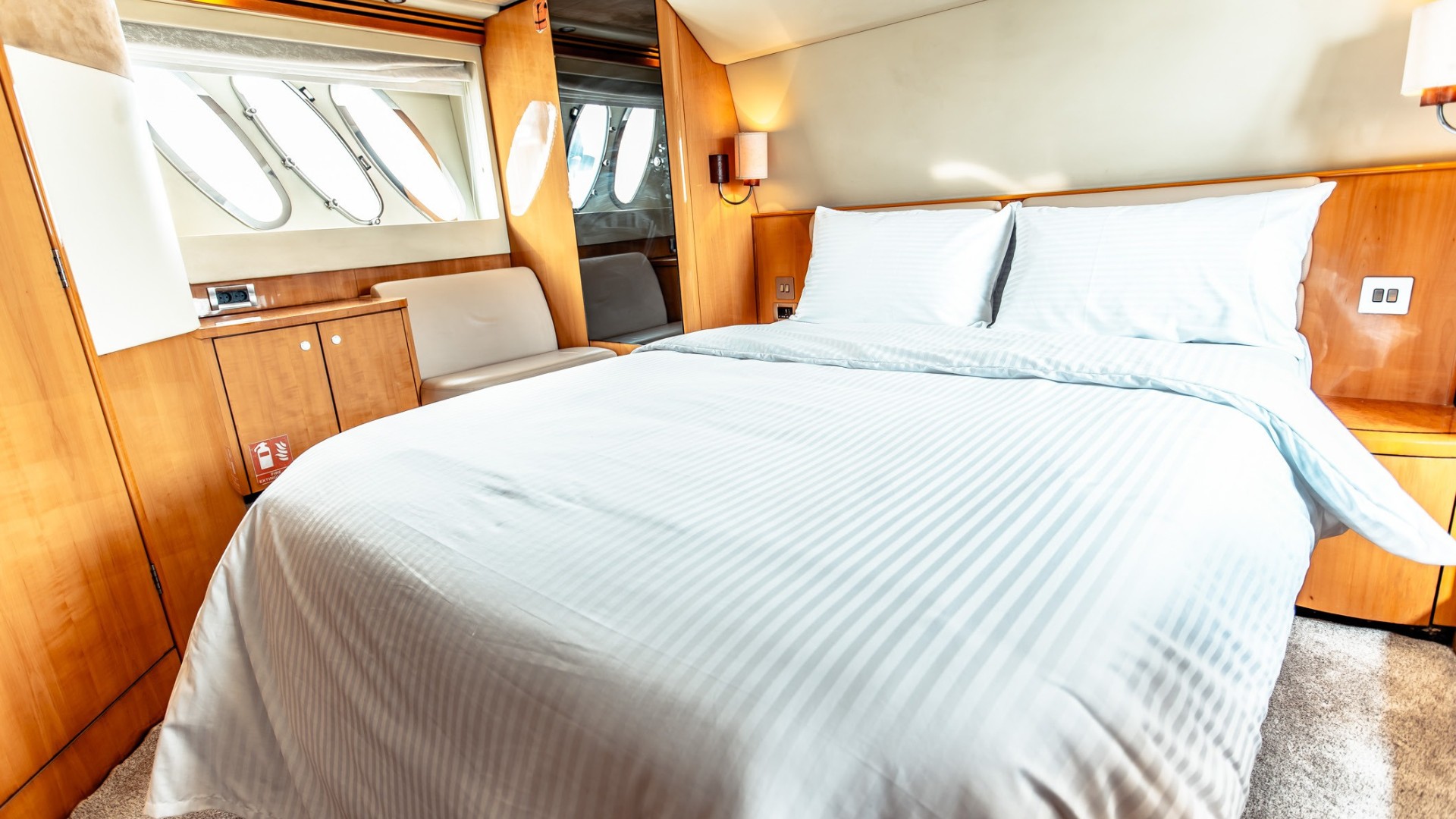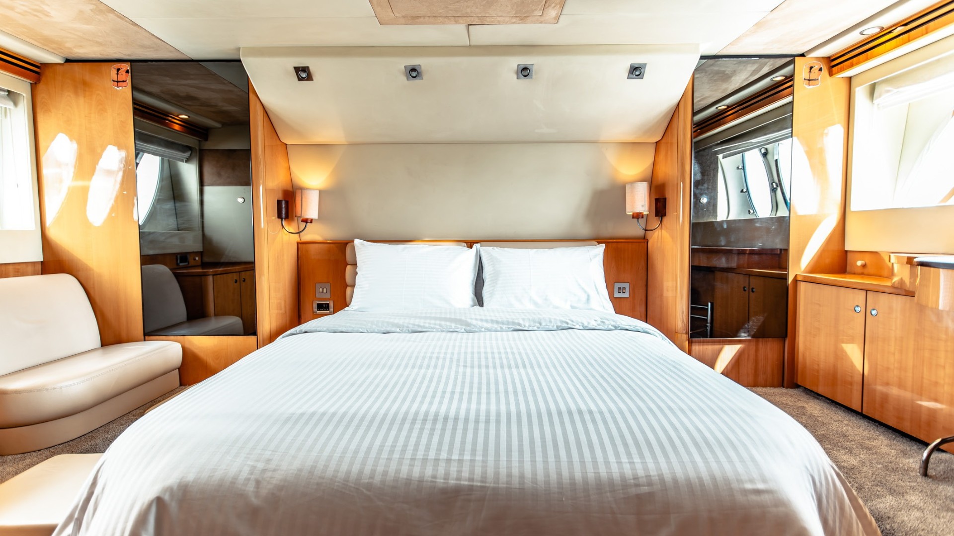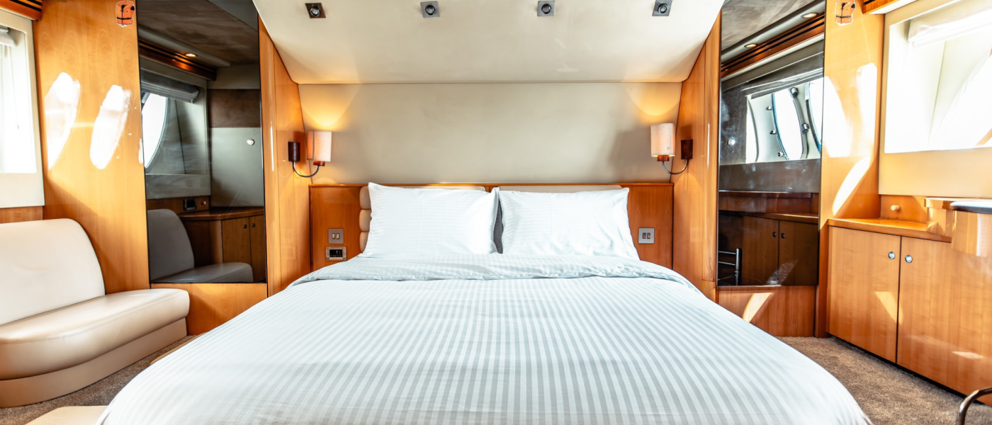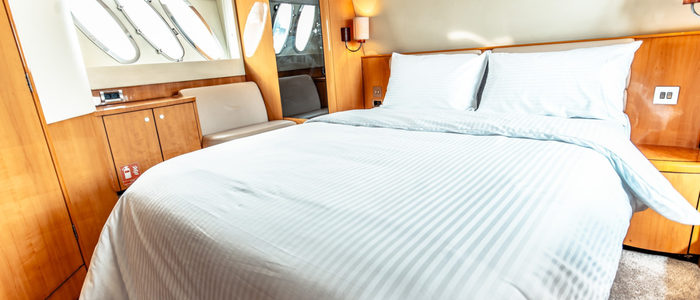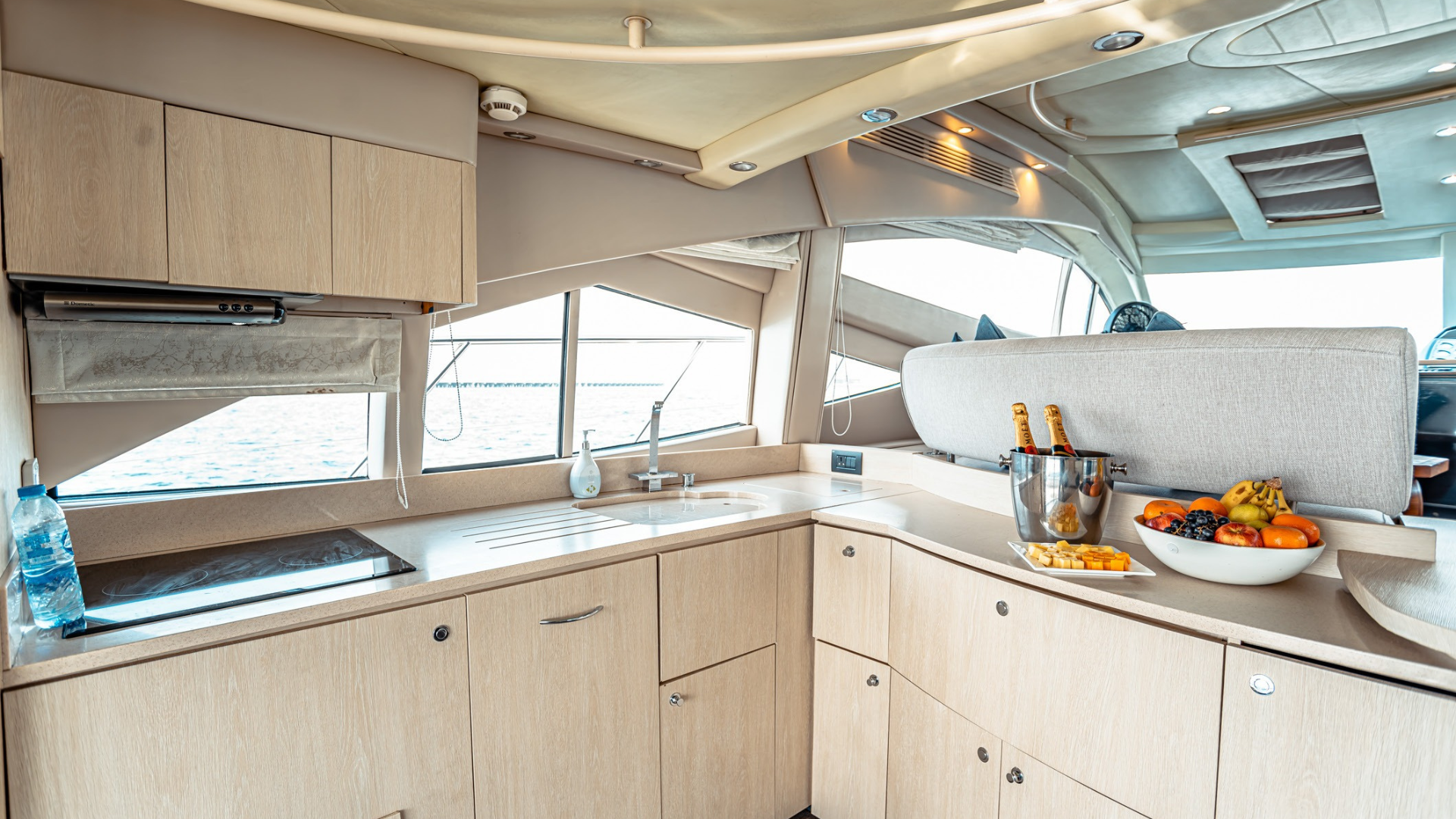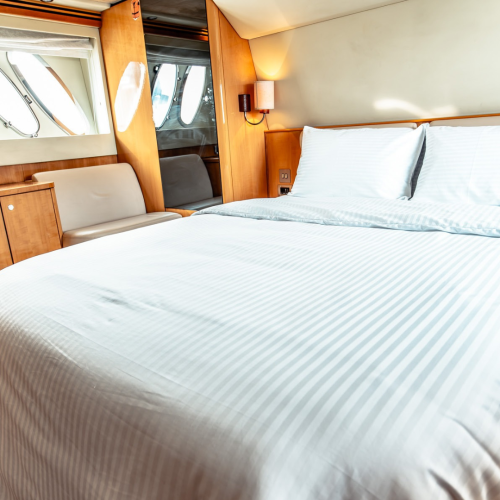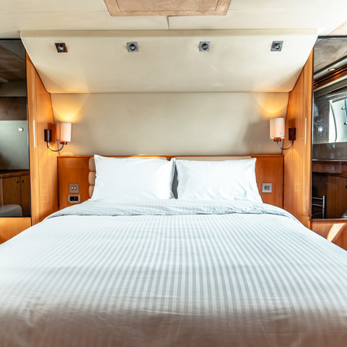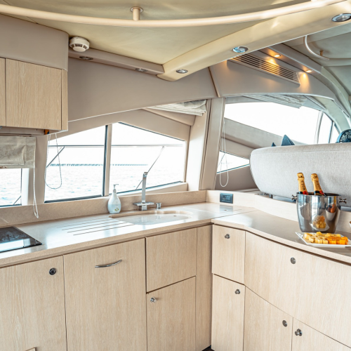 Featuring two comfortable bedrooms and two modern bathrooms, the yacht ensures a cozy and relaxing overnight stay. The spacious flybridge offers panoramic sea views, lounge seating, and sunbeds perfect for sunbathing, unwinding, or enjoying cocktails with friends.