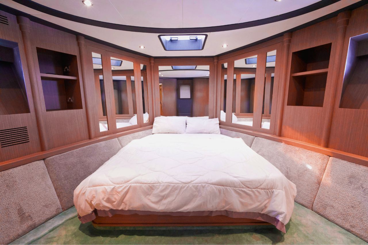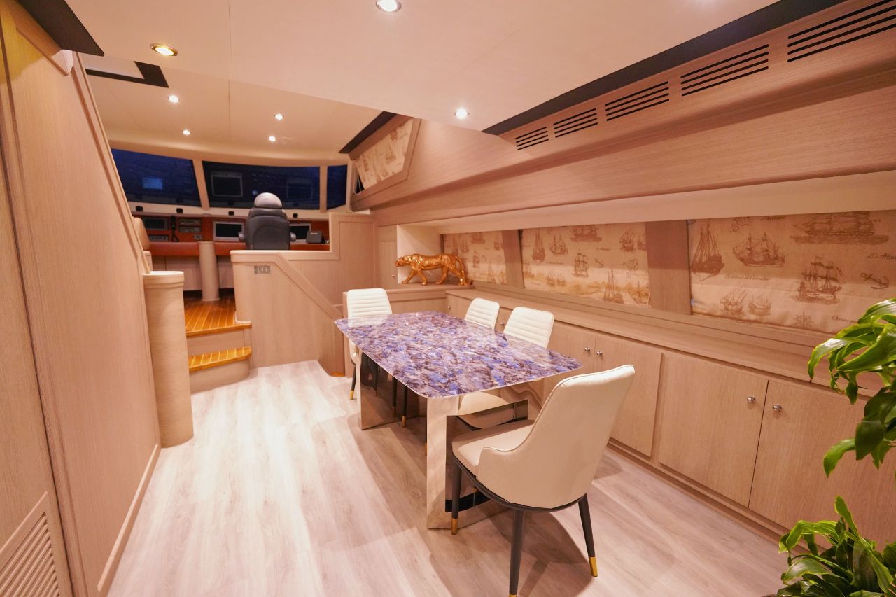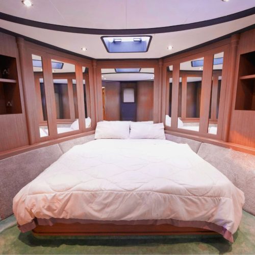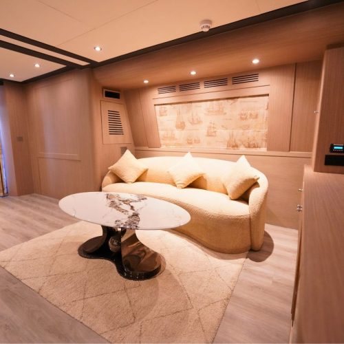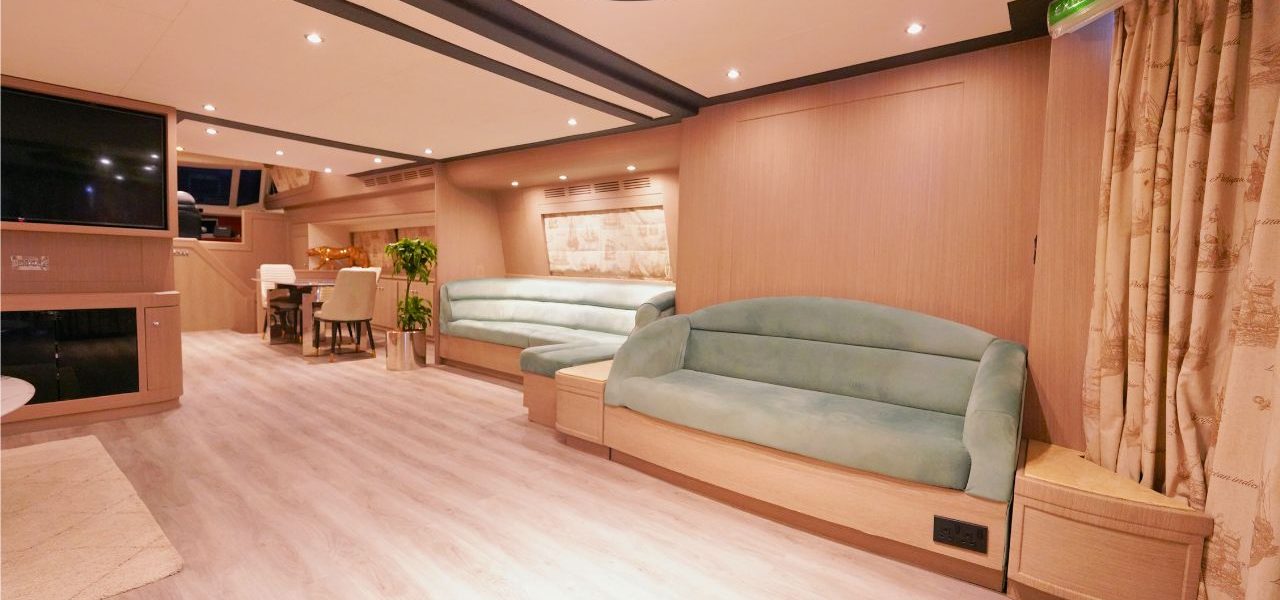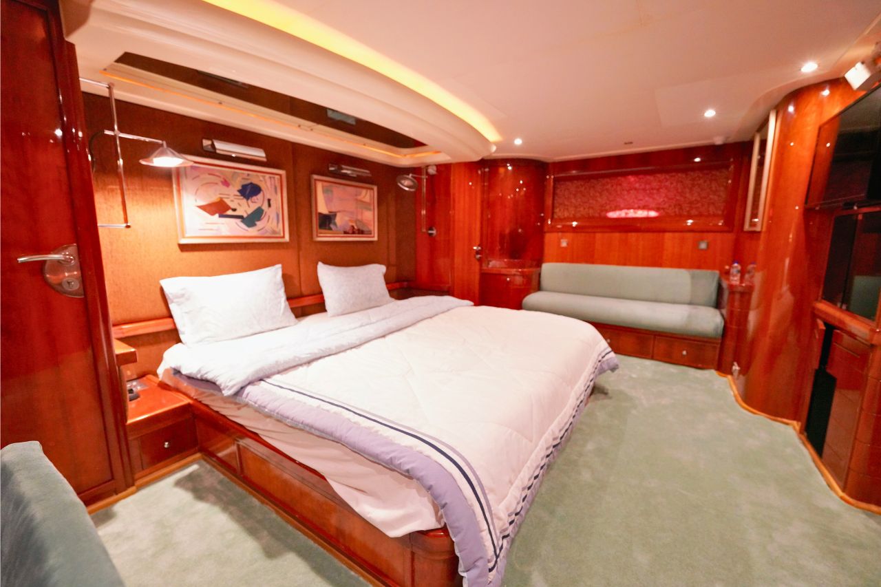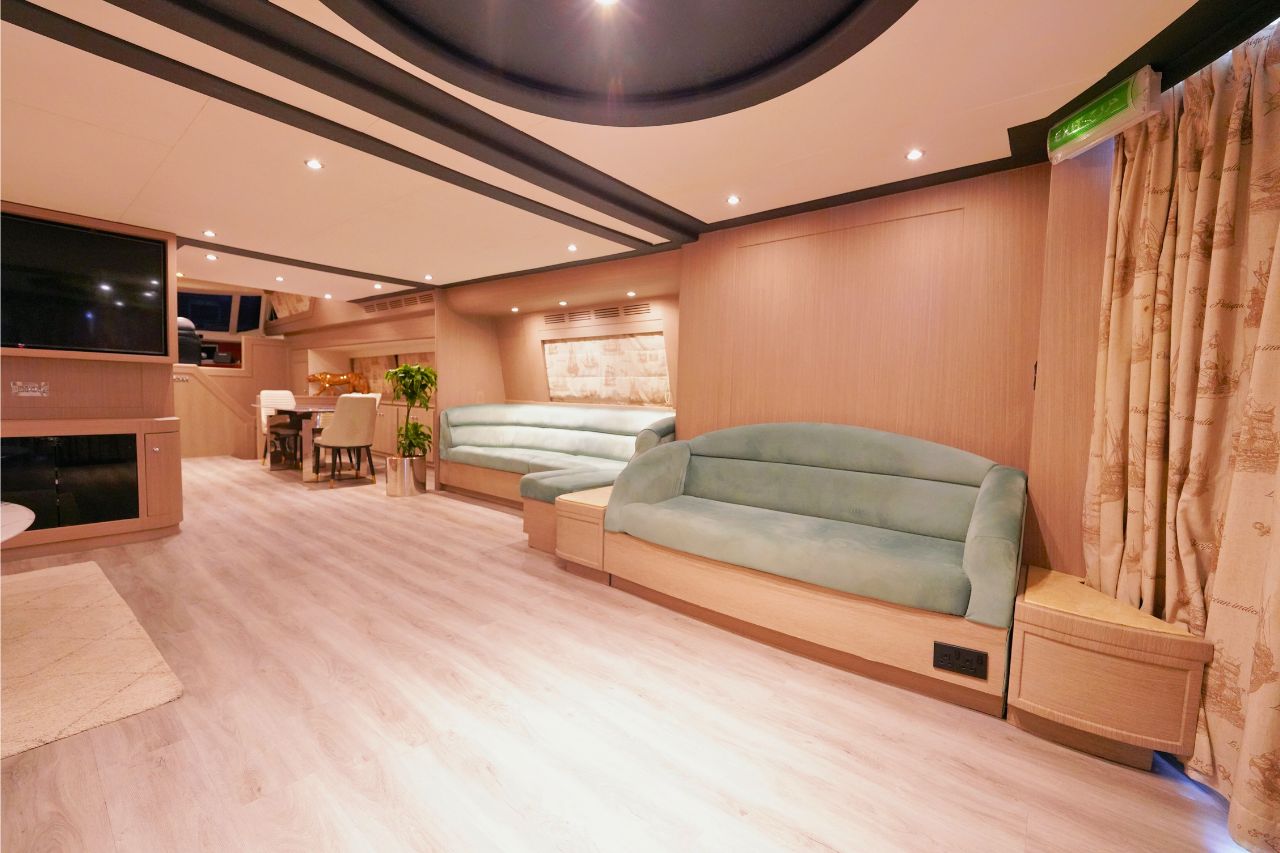 Inside, the yacht features four beautifully designed bedrooms and four modern bathrooms, ensuring a relaxing and comfortable stay for overnight guests. The spacious flybridge offers sweeping ocean views, generous seating, and sun loungers ideal for sunbathing, unwinding, or simply enjoying the view. To elevate your journey even further, the on-deck Jacuzzi provides the perfect spot to relax in pure luxury.